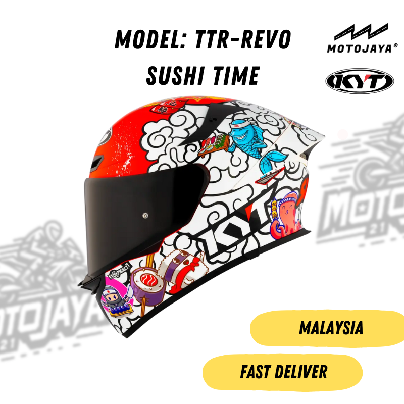 - Full-face helmet design for comprehensive head protection. - Unique "SUSHI-TIME" graphic design, providing a distinctive aesthetic. - Designed for motorcycle riders seeking both safety and style. - Likely features a multi-density EPS liner for impact absorption - Ventilation system for enhanced airflow and rider comfort - Visor provides clear vision and protection from the elements - Certified with ECE 22.06 safety standards, ensuring compliance with safety regulations. - Size: XS-XXL