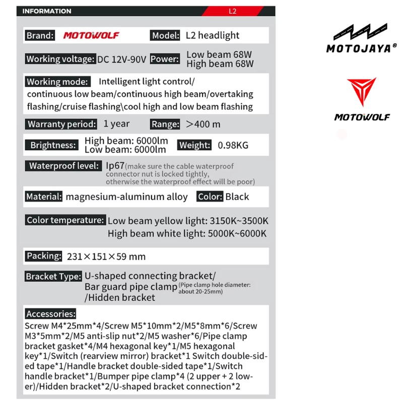 - Brightness: High beam: 6,000 lumens, Low beam: 6,000 lumens